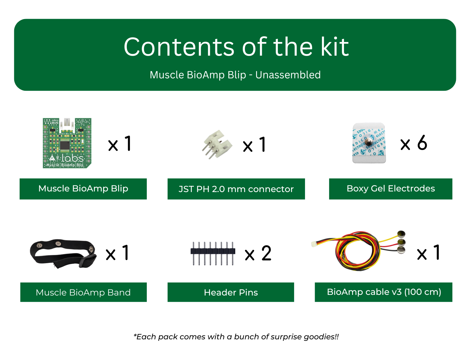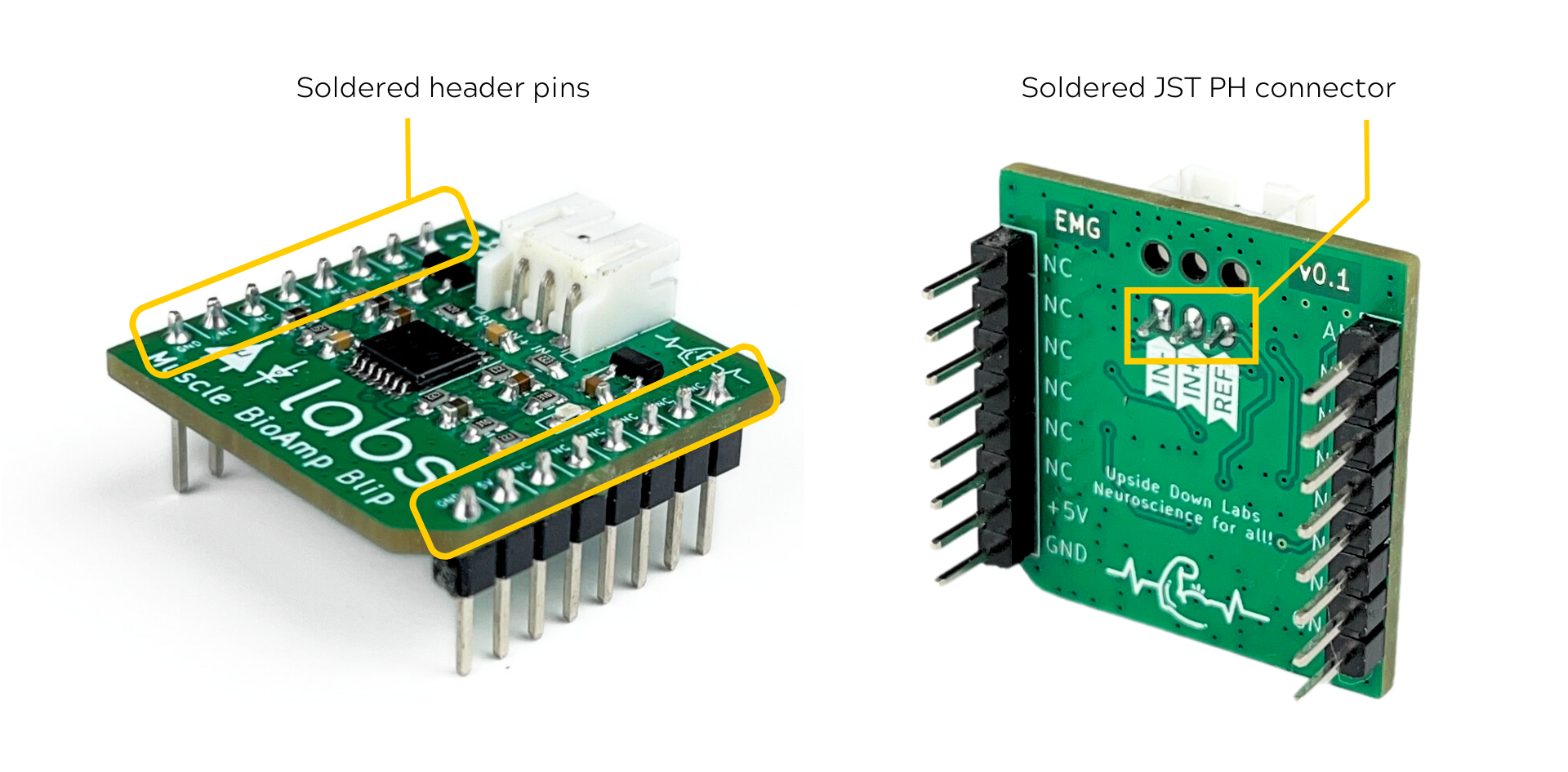 Solder the header pins and JST Ph 2.0mm connector on the Muscle BioAmp Blip as shown below. If you ordered assembled kit then you can skip this step and directly move to step 2.