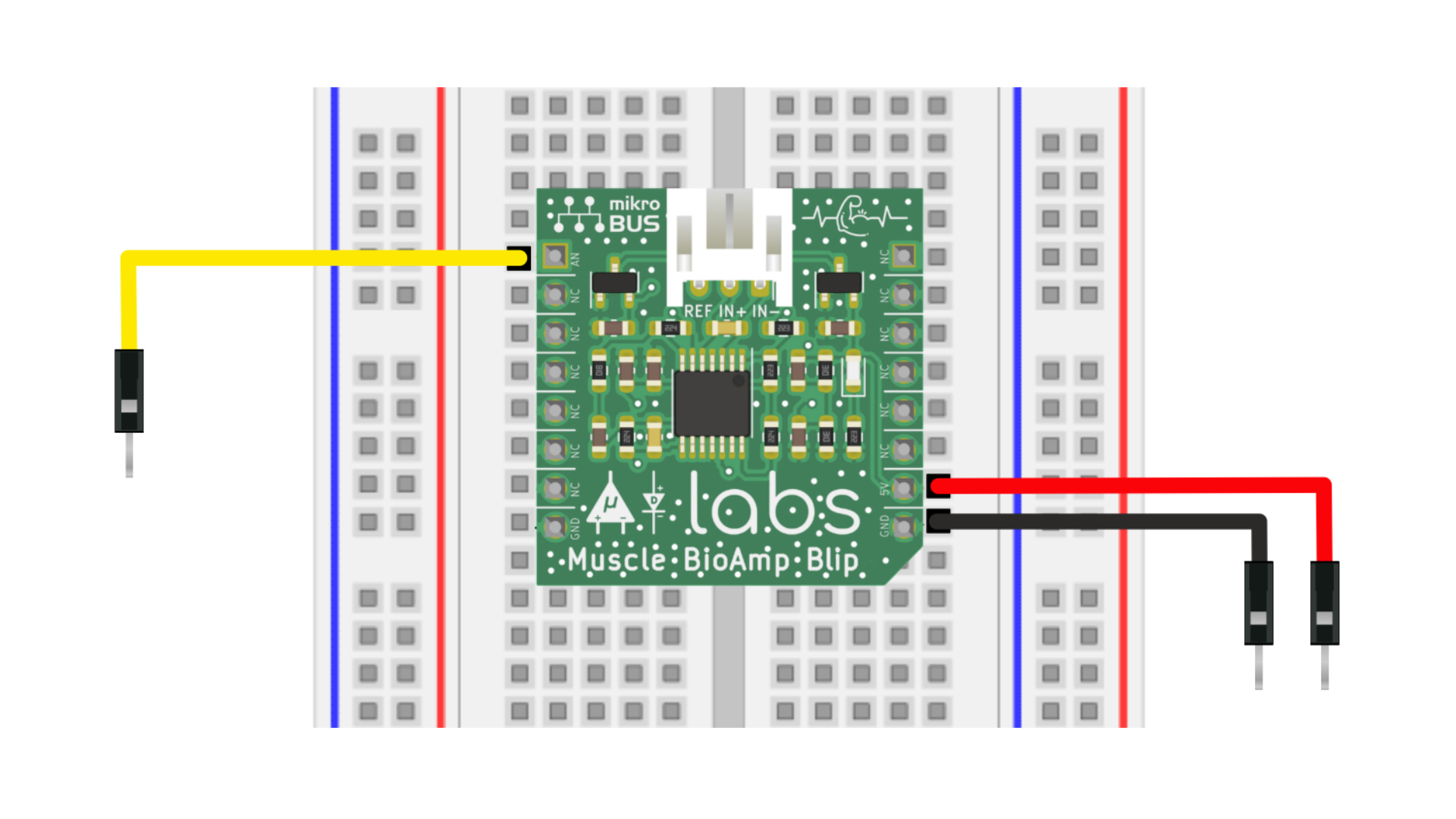 If you are thinking to connect more components/sensors and want to integrate Muscle BioAmp Blip in the complete circuit then it will be better to use a breadboard. Snap the Muscle BioAmp Blip on the breadboard and connect the jumper cables (male to male) at 5V, GND, AN.