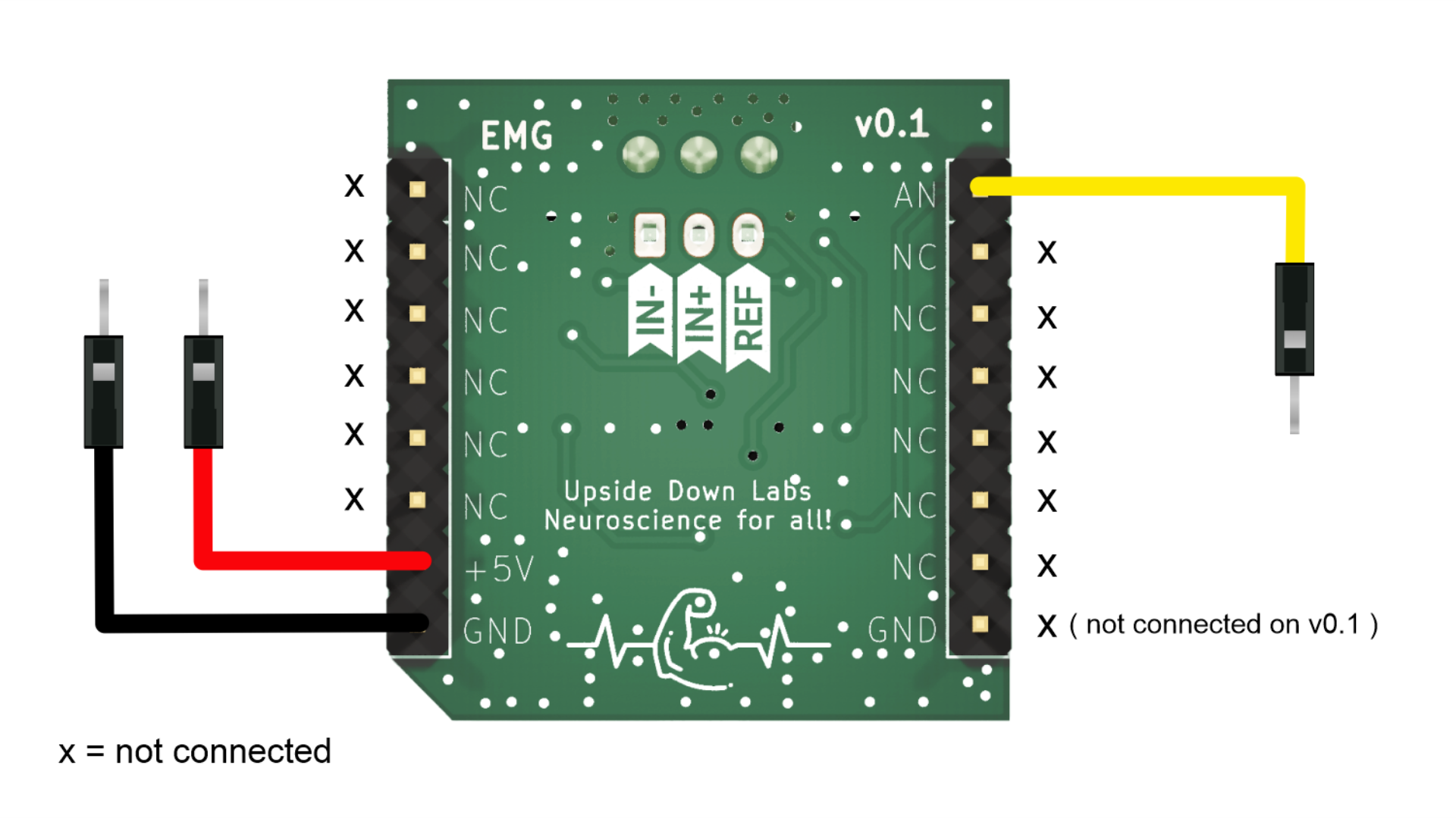 You can directly connect the male to female jumper cables on the header pins of Muscle BioAmp Blip at 5V, GND, AN.