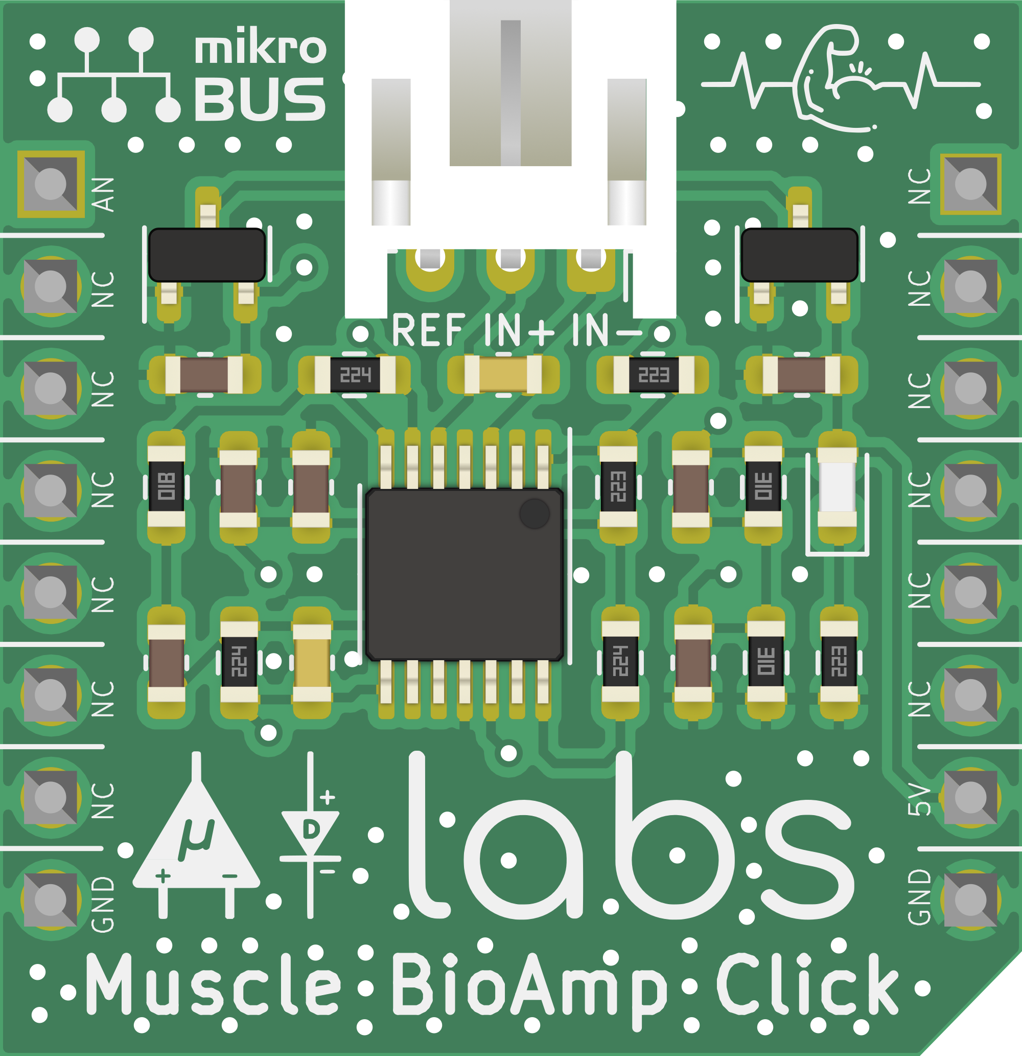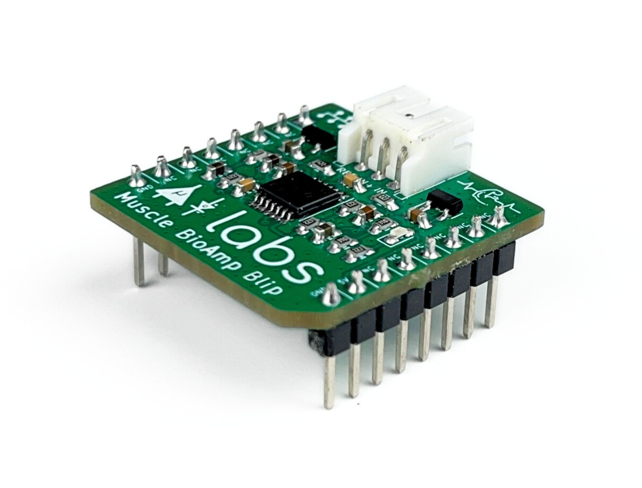 Muscle BioAmp Blip [1] is single channel mikroBUS™ [2] compatible ElectroMyography (EMG) sensor for precise muscle signal recording. It allows you to add the EMG functionality to your projects at ease. You can either connect it to any mikroBUS™ port or even a breadboard to get started.