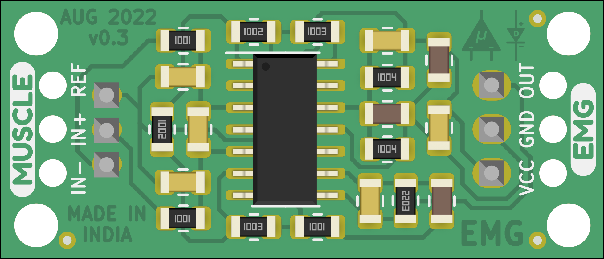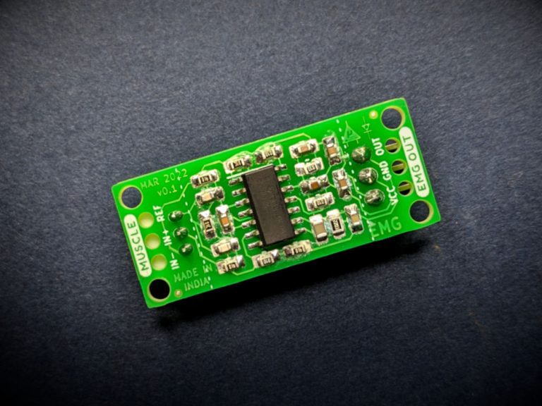 A candy-size single-channel ElectroMyography (EMG) sensor for recording of muscle signals at an affordable cost. It is an SMD version of Muscle BioAmp Biscute that can be used to make amazing Human-Computer Interface (HCI) projects.