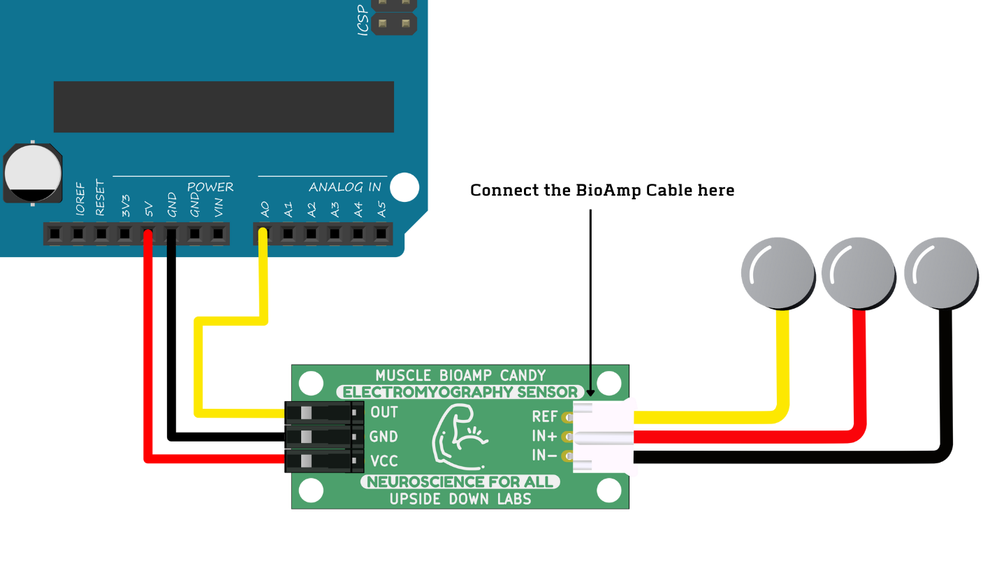Connect the BioAmp cable to Muscle BioAmp Band in a way such that IN+ and IN- are placed on the arm near the ulnar nerve & REF (reference) on the far side of the band.