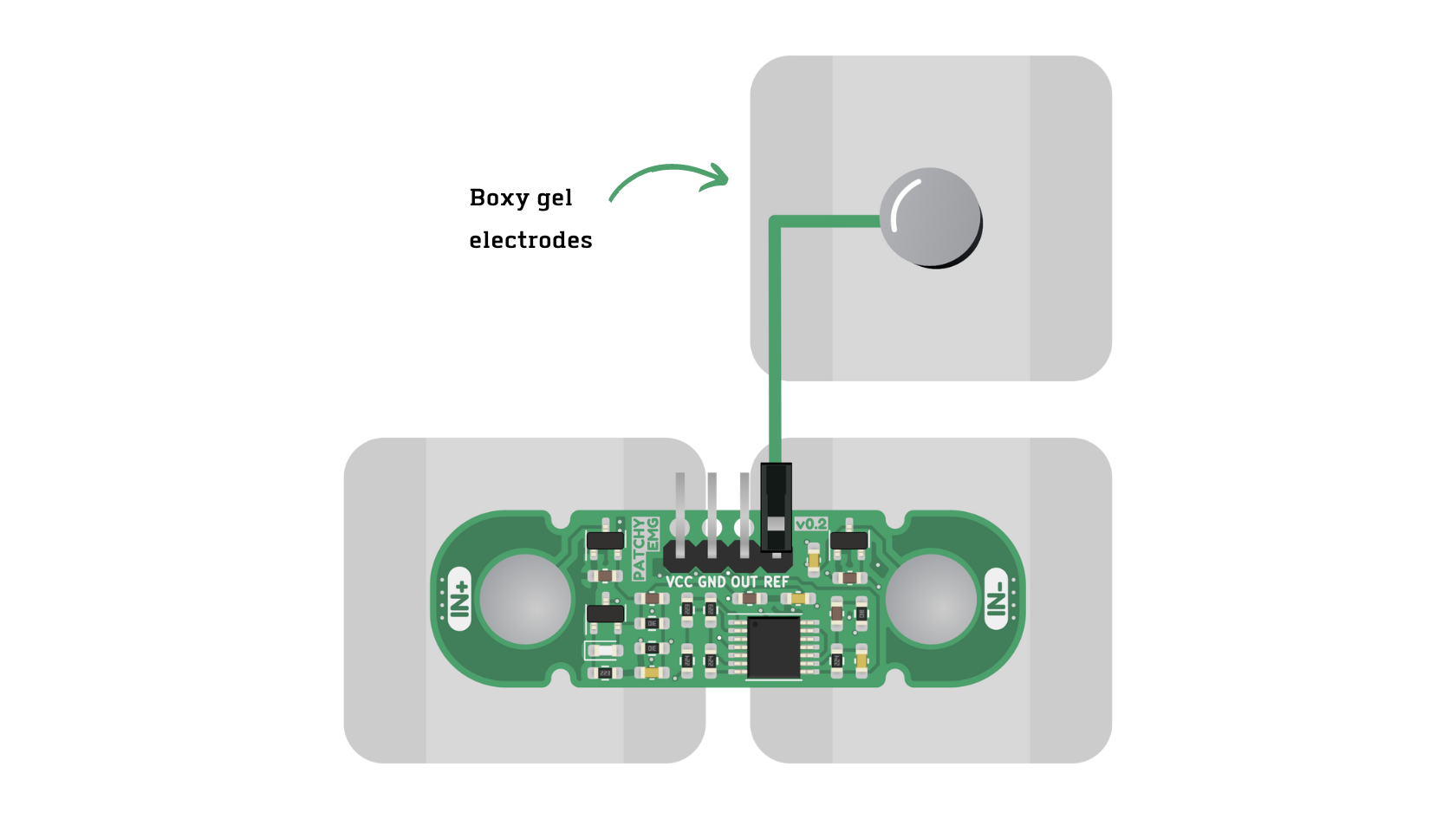 Snap the Muscle BioAmp Patchy on the gel electrodes (Don’t peel the plastic backing from the electrodes at this moment).