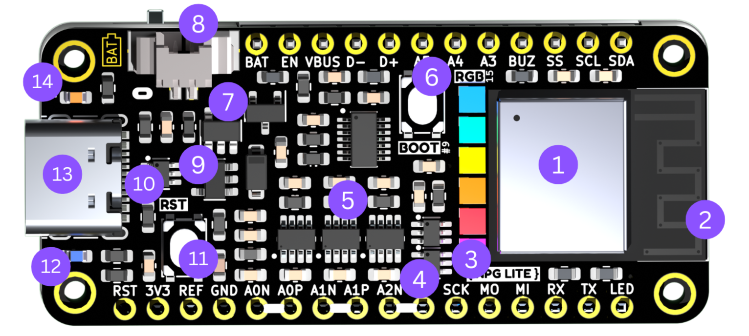 With the addition of NPG Playmate Boards and 3rd party FeatherWing boards, users can easily enhance the device’s capabilities, enabling them to create awesome Human-Computer Interface (HCI) and Brain-Computer Interface (BCI) applications. Its extensive compatibility lets you equip your device with features like a vibration motor for haptic feedback, a buzzer for audio feedback, and I2C connectivity, making it highly versatile for a wide range of applications.