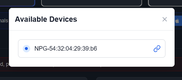 Wait for the Available Devices dialog to list your NPG device (e.g. NPG-54:32:04:29:39:b6) and click its link icon.