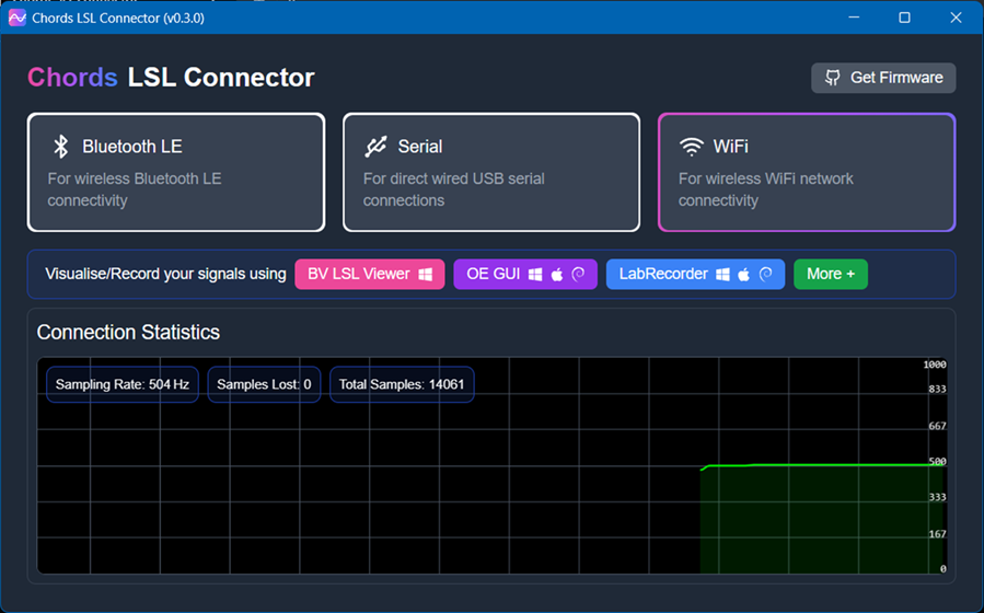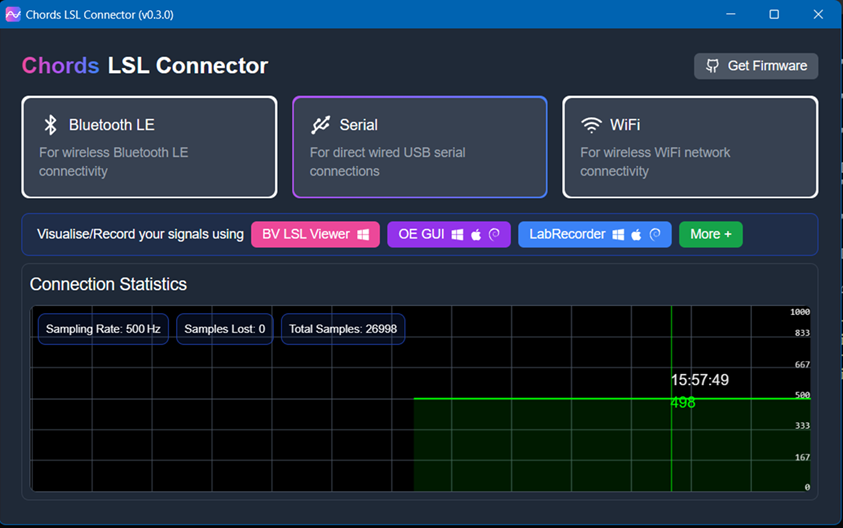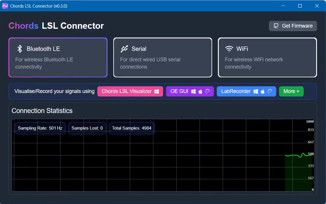 The Chords-LSL-Connector bridges your Neuro Playground Lite (running Chords Firmware) to the LSL ecosystem, providing: