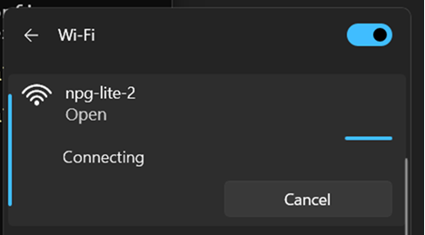Open your computer’s Wi-Fi settings, select the NPG Lite device (e.g. npg-lite-2) network from the list, and click Connect - you’ll see “Connecting” followed by “Connected” once the link is established.